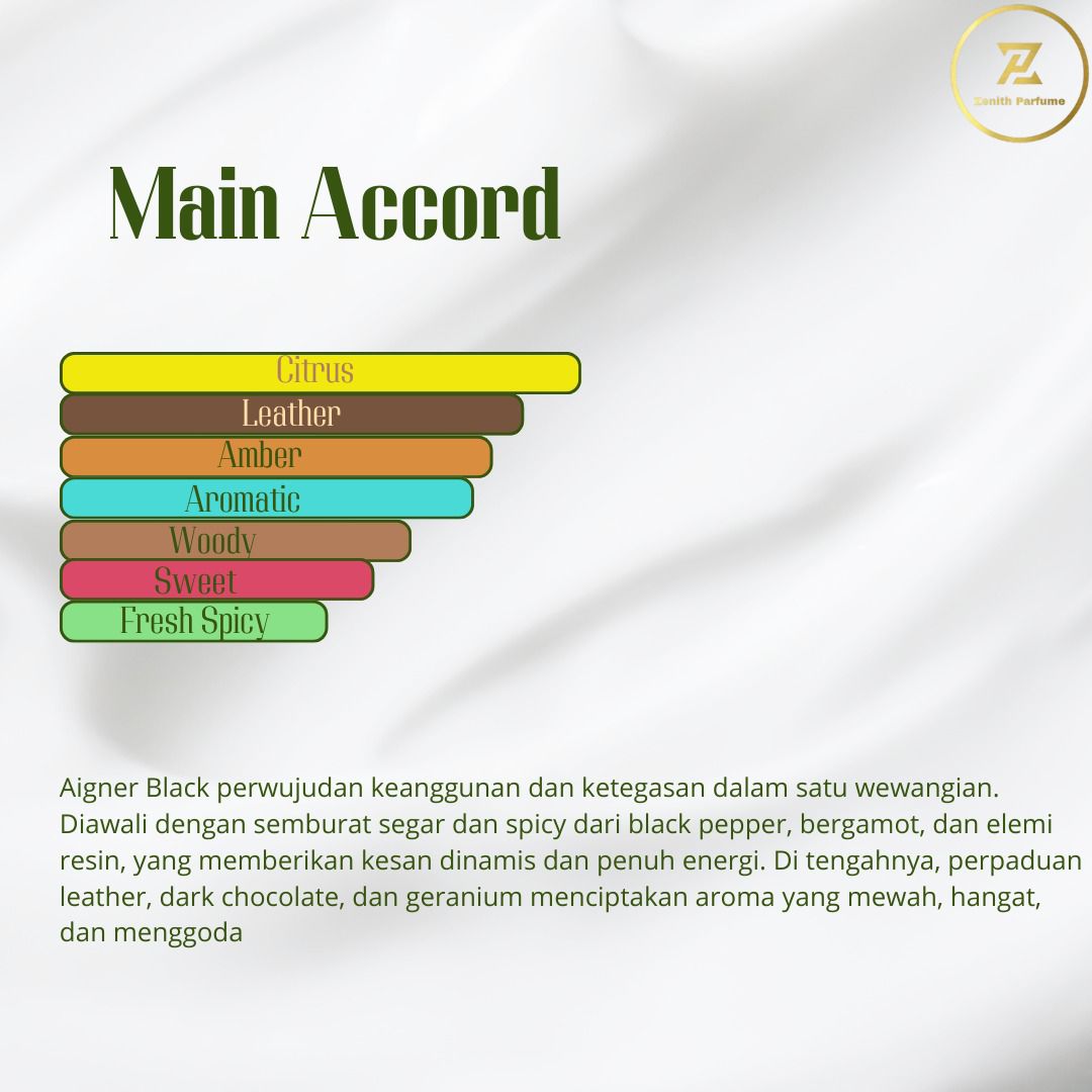 Aroma maskulin yang memadukan citrus dan leather dengan sentuhan spicy yang segar. Cocok untuk pria berkarisma yang ingin tampil tegas dan elegan.