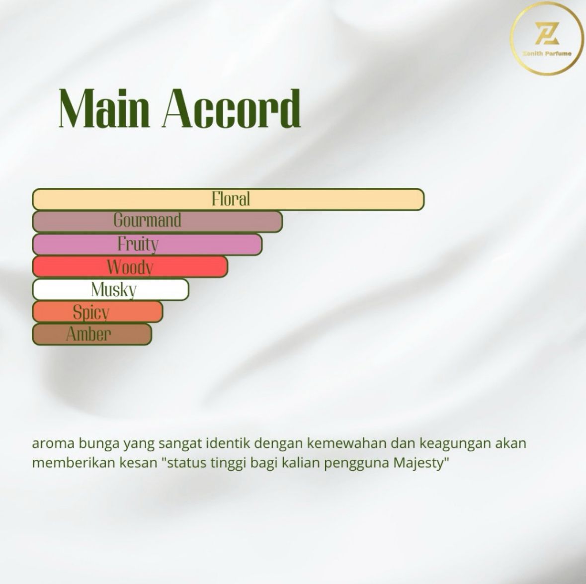 Dominasi floral dan gourmand yang memancarkan kesan mewah dan berkelas. Sangat cocok untuk tampil glamor dan mencolok.