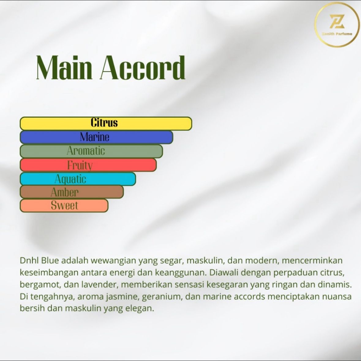 Aroma citrus dan marine yang segar dan modern. Mencerminkan pria yang maskulin, dinamis, namun tetap elegan.